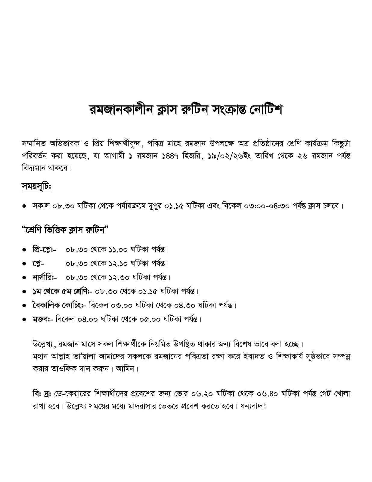 সম্মানিত অভিভাবক ও প্রিয় শিক্ষার্থীবৃন্দ, পবিত্র মাহে রমজান উপলক্ষে অত্র প্রতিষ্ঠানের শ্রেণি কার্যক্রম কিছুটা পরিবর্তন করা হয়েছে, যা আগামী ১ রমজান ১৪৪৭ হিজরি, ১৯/০২/২৬ইং তারিখ থেকে ২৬ রমজান পর্যন্ত বিদ্যমান থাকবে।